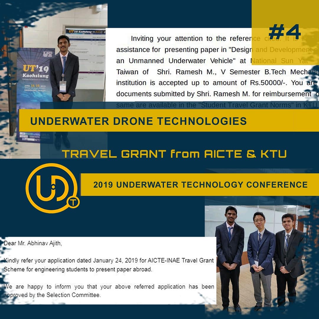 Abhinav Ajith and Ramesh M, integral members of our team, represented us at the International Underwater Technology Conference 2019 in Kaohsiung, Taiwan, conducted by IEEE. During the conference, they presented and published a paper on our innovative underwater drone system, contributing to the global discourse on advancements in underwater technology.